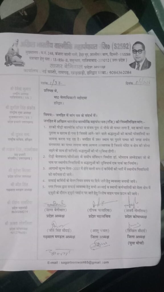 एवं ज्ञापन सौंप कर हरकी पैड़ी क्षेत्र के समीप सविधान निर्माता बाबा साहेब डॉ भीमराव अम्बेडकर जी के नाम पर एक पार्क बनाने व हरकी पैड़ीअस्थि प्रवाह घाट वाल्मीकी मंदिर परंगन का नवीनीकरण कराने की मांग की साथ ही आने वाले कुम्भ भर्ती मे स्थानीय लोगो को वरीयता देने की मांग की।