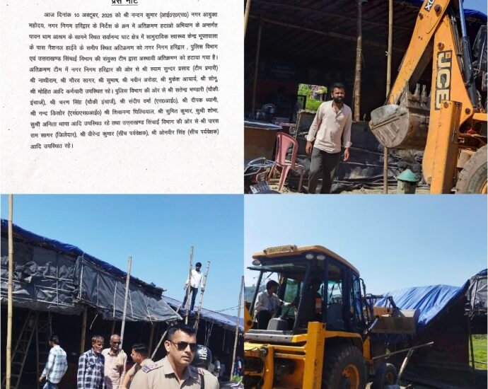 आज दिनांक 10 अक्टूबर, 2025 को श्री नन्दन कुमार (आई०ए०एस०) नगर आयुक्त महोदय, नगर निगम हरिद्वार के निर्देश के क्रम में अतिक्रमण हटाओ अभियान के अन्तर्गत पावन धाम आश्रम के सामने स्थित सर्वानन्द घाट क्षेत्र में सामुदायिक स्वास्थ्य केन्द्र भूपतवाला के पास नैशनल हाईवे के समीप स्थित अतिक्रमण को नगरContinue Reading
