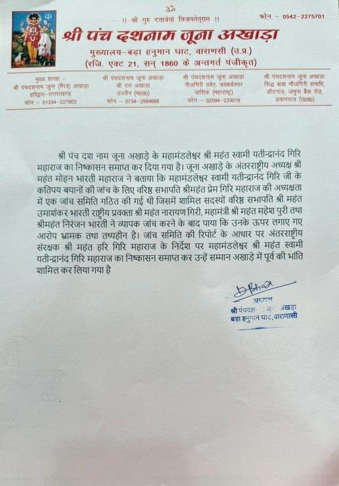 श्री महंत मोहन भारती महाराज ने बताया कि महामंडलेश्वर यतींद्रानंद गिरि महाराज के प्रति खेद व्यक्त करते हुए अखाड़े में उनकी प्रतिष्ठा व सम्मान के अनुरूप वापसी की गई है।