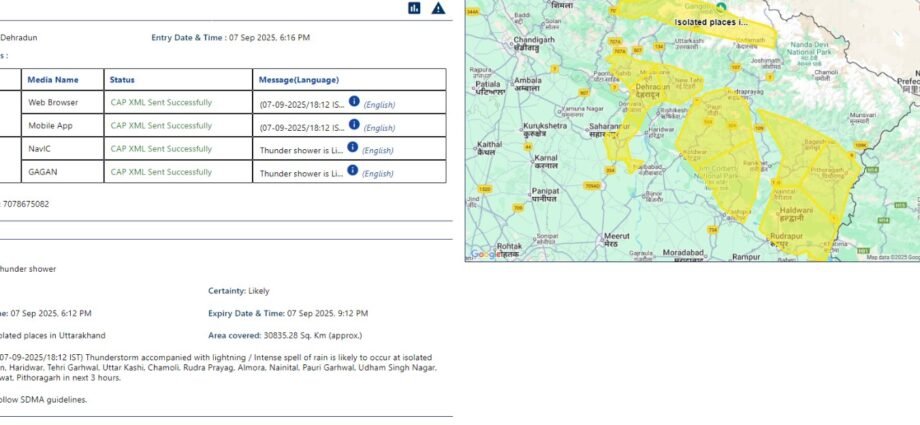 अगले 3 घंटों में ( येलो अलर्ट दिनांक 07 Sep 2025, 06:12 PM बजे से दिनांक 07 Sep 2025, 09:12 PM बजे तक ) जनपद -देहरादून, हरिद्वार, टिहरी गढ़वाल, उत्तर काशी, चमोली, रुद्र प्रयाग, अल्मोडा, नैनीताल, पौडी गढ़वाल, उधम सिंह नगर, बागेश्वर, चंपावत, पिथौरागढ में अलग-अलग स्थानों पर यथा -, रूड़की. मसूरी, श्रीनगर, लैंसडाउन, रामनगर, कोसानी, गंगोलीहाट, लोहाघाट तथा इनके आस पास के क्षेत्रो मे बिजली कड़कने के साथ गरज के साथ तूफान / तेज बारिश होने की संभावना है